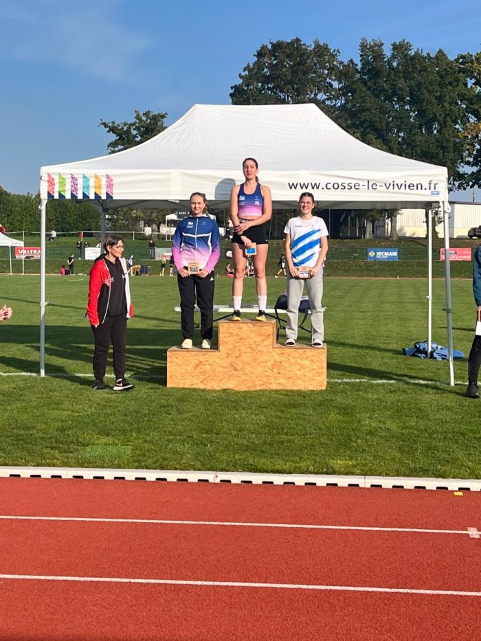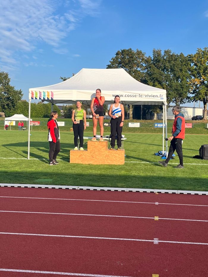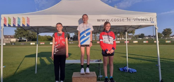 A Cossé le Vivien, les jeunes du Club se sont affrontés sous un beau soleil automnal. A noter la belle victoire au triathlon benjamines de Chloé Chérel nouvellement arrivée avec 103 pts grâce à un très beau 1000m bouclé en 3’27. Héloise Bourbon se classe deuxième au 200m ainsi que Joséphine Huet au 100m.